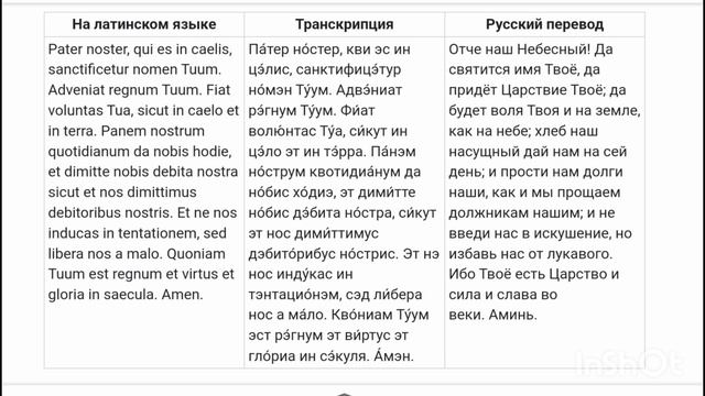 Отче наш. Молитва Господня на латыни (с транскрипцией). На латыни. Pater noster, qui es in caelis, sanctificetur nomen tuum. Adveniat regnum tuum. Fiat voluntas tua, sicut in caelo et in terra. Panem nostrum quotidianum da nobis hodie, et dimitte nobis debita nostra sicut et nos dimittimus debitoribus nostris. Et ne nos inducas in tentationem, sed libera nos a malo. Quoniam Tuum est regnum et virtus et gloria in saecula. Amen. Транскрипция. Па́тер но́стер, кви эс ин цэ́лис, санктифице́тур но́мен ту́ум. Адве́ниат ре́гнум ту́ум. Фи́ат волю́нтас ту́а, си́кут ин цэ́ло эт ин те́рра. Па́нем но́струм квотидиа́нум да но́бис хо́дие, эт дими́тте но́бис дэ́бита но́стра, си́кут эт нос дими́ттимус дэбито́рибус но́стрис. Эт нэ нос инду́кас ин тэнтацио́нем, сэд ли́бера нос а ма́ло. Куониам ту́ум эст ре́гнум эт ви́ртус эт гло́рия ин секула. Амэн.