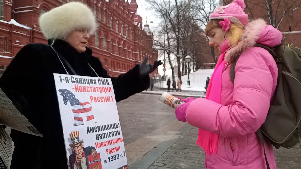Москва. Пост № 1. Манежная Площадь. Одиночный информационный пикет участника Национально-Освободительного Движения (НОД). Ежедневно пикетчики Национально-Освободительного Движения рассказывают соотечественникам о правовой диверсии в нашей конституции о внешнем управлении государством и о начале сбора решений (подписей) граждан с 1 марта за проведение всенародного референдума по изменению статей 9.2 ; 13.2 и 15.4 нашей конституции, что позволит вернуть нам суверенитет России, утерянный в 1991-93 гг.