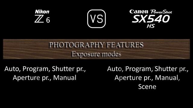 This video overviews the Nikon Z6 and the Canon PowerShot SX540 HS in a parallel comparison of specifications. Thanks for watching. If you liked this video and found it informative, make sure to subscribe for more. 00:24 LAUNCH 00:32 BODY 00:41 SENSOR 01:05 IMAGE 01:21 OPTICS & FOCUS 02:10 SCREEN 02:30 VIEWFINDER 02:46 PHOTOGRAPHY FEATURES 03:47 VIDEOGRAPHY FEATURES 04:04 STORAGE 04:08 CONNECTIVITY 04:36 PHYSICAL 04:56 MISC