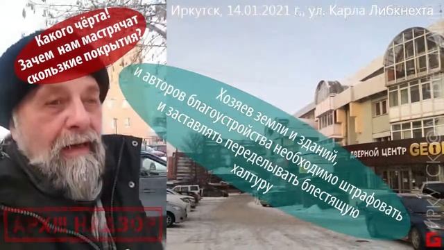- Улица Карла Либкнехта зимой. Какие нам (не)нужны тротуары? Какого чёрта! Зачем нам мастрячат скользкие покрытия? На пяти мерах тротуара у "Бизнес-центра" я два раза подскользнулся и едва не упал! Владельцев территории и авторов благоустройства необходимо штрафовать и заставлять переделывать их блестящую халтуру. Фрагмент из https://youtu.be/r_D4UQGzx1w © БЕСЕДИН ОЛЕГ, ВИДЕО-КАНАЛ: искусство, архитектура, дизайн, уроки, мастер-классы, репортажи. Жизнь! * * * Мои добрые друзья и помощники, спонсоры канала: Особая благодарность: ❤ Павел Стороженко (Москва) Спасибо за донаты и поддержку: – Юлия Иванова (Чита) – Анна Павловна Г. – Сергей Ким – Дина Накиповна М. – MINARG – Artak Weber – БУДНИ ТРОИЧАНИНА – Косачёв Андрей – Helena Malakhova – Вихров Валентин – Сергей Александрович Т. – Елена ============================= DONATE-ART – акция, добровольные взносы – Ваш знак того, что моя работа интересна и нужна. Перечислите мне символический донат и сообщите о желании участвовать в акции – это позволит мне сформировать круг друзей – закрытую группу, для которых я делаю эксклюзивные публикации и особо интересные уроки, делюсь секретами, персонально отвечаю на вопросы в интерактивном онлайн режиме. DONATE: – На мобильный Сбербанк по тел. 89500620251 или просто оплатить этот номер телефона (ТЕЛЕ-2) – Карта Сбербанк (получатель Олег Владимирович) "МИР" 2202 2007 9327 5692 – Карта Бин-Банк-Открытие (получатель Олег Владимирович) "VISA" 4627 0342 1430 6486 – Yandex-деньги: 410012167239706 Спасибо! Это даёт мне возможность работать и жить :-) * * * Welcome to the community: "Urban Sketching, Art and Travel РИСУЕМ ГОРОД!" https://www.facebook.com/groups/UrbanSketching.ArtTravel Welcome to the community: "Графический портрет. Graphic portrait" https://www.facebook.com/groups/portrait.graphic.art/ Авторские страницы: "ПРОгулки художника по Иркутску": https://www.facebook.com/Besedin.Irkutsk.Art/ facebook.com/oleg.besedin instagram.com/besedin.irkutsk besedin-oleg.livejournal.com vk.com/besedin_oleg ok.ru/besedin