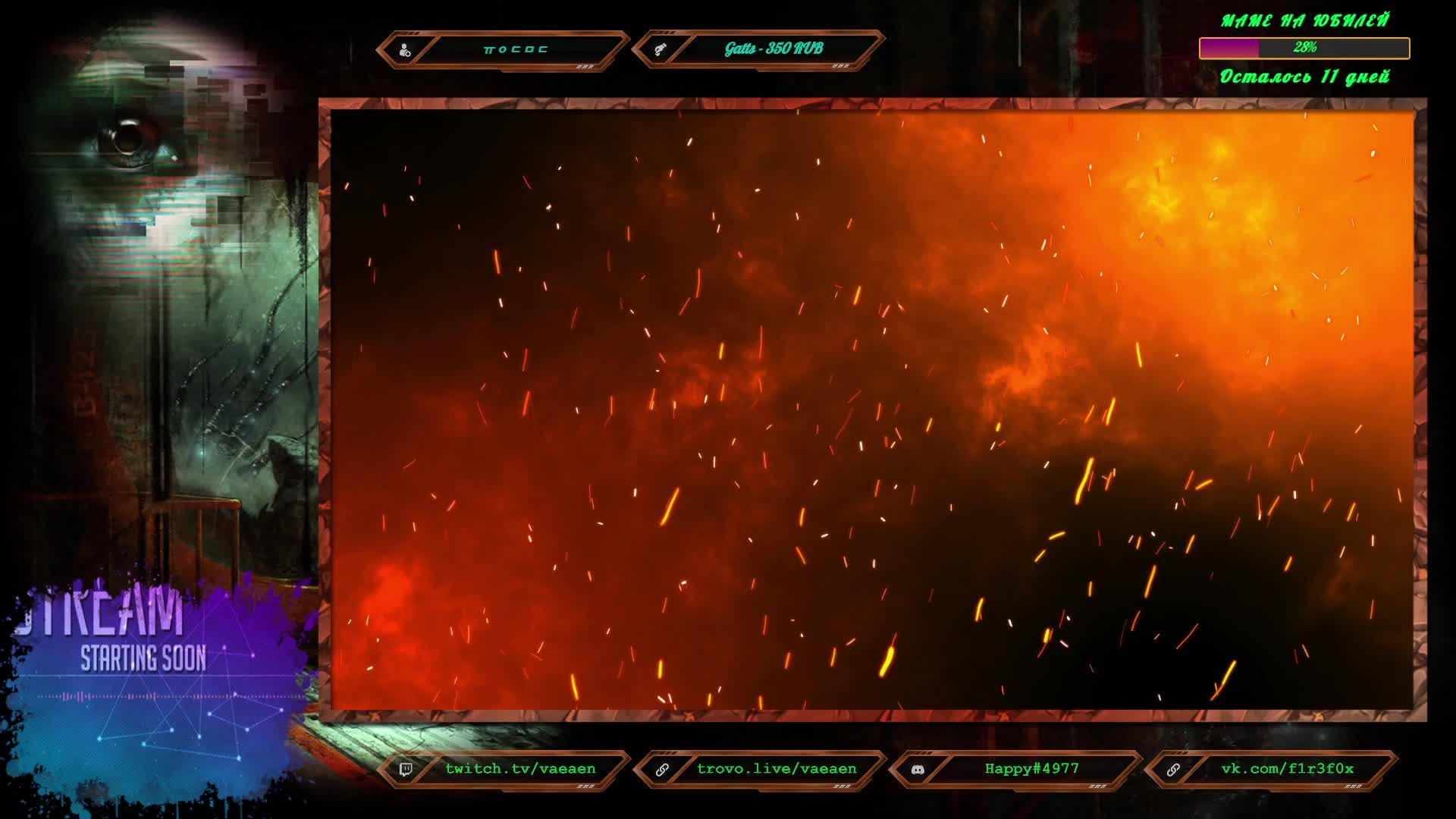 Если хотите поддержать меня как стримера - нажмите по данной ссылке! https://www.donationalerts.com/r/f1r3f0x Во время стрима ваше сообщение появится на экране, и будет сопровождаться голосовым диктором. Поддержка на Boosty - https://boosty.to/vaeaen Поддержка без комиссии: 2202 2010 0629 1039 Основные каналы: Twitch: https://www.twitch.tv/vaeaen Trovo: https://trovo.live/Vaeaen GoodGame: https://goodgame.ru/channel/Vaeaen/