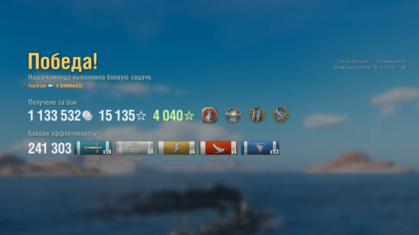 Эсминец Shimakaze Игрок: FeniXster (EU) Карта: Слёзы пустыни - Случайный бой Урон: 241к Shimakaze - Эсминец Японии 10 уровня