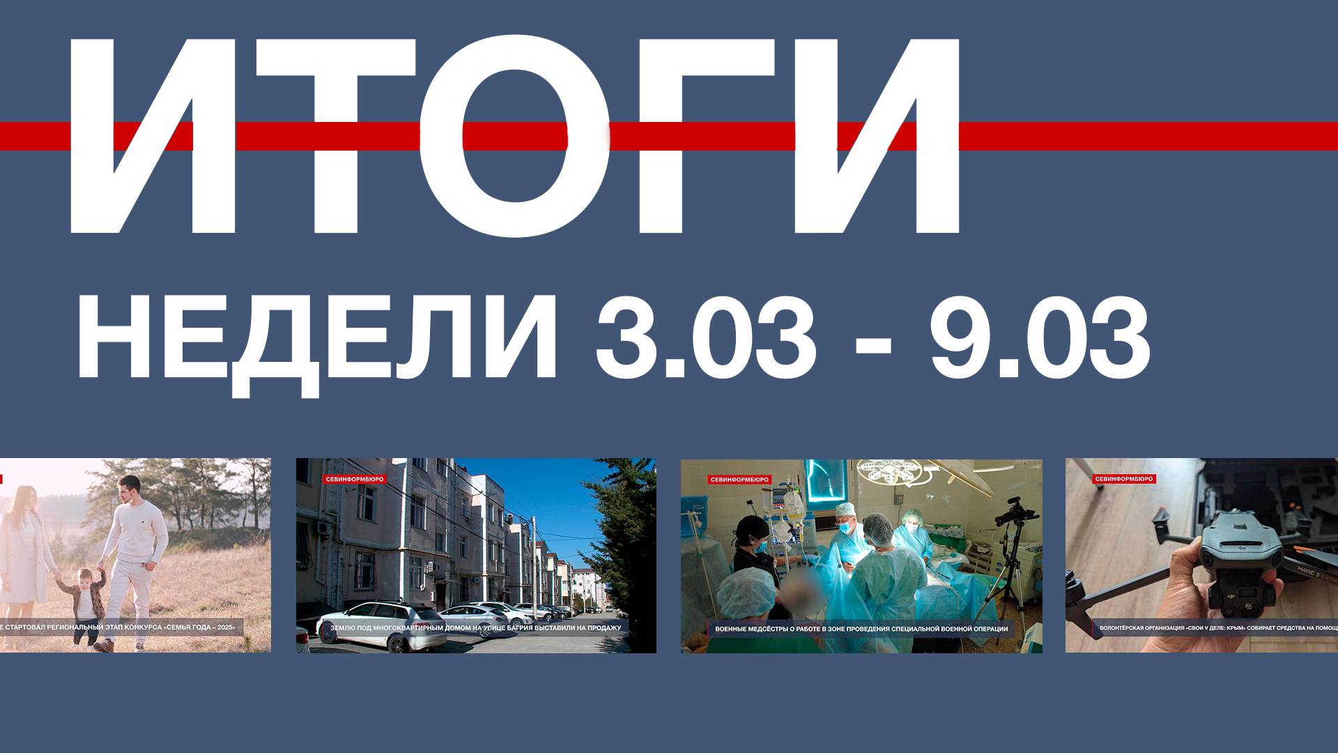 Главные новости за неделю: - В Севастополе вновь национализировали имущество спонсоров украинского режима - Власти Севастополя приступили к подготовке к пляжному сезону 2025 года - В Севастополе запустят 8 мер поддержки для увеличения рождаемости - В Севастополе стартовал конкурс «Семья года – 2025» - В Севастополе появится новый тип остановок общественного транспорта - Земля под многоквартирным домом продаётся на «Авито» - ДИЗО посоветовал собственникам квартир на улице Багрия 75-9 обратиться в суд - Члены кооператива «Кристалл» на Радиогорке бьются за право легализовать гаражи - Кору ливанских кедров у администрации Гагаринского района обработали садовым варом - В Севастополе появилась новая памятная дата – 12 мая - Севастопольские волонтёры просят помощи со сбором средств на нужды бойцов спецоперции - Герои для героев как военные медсёстры из Севастополя спасают бойцов в зоне проведения СВО - Музей обороны Севастополя поздравил женщин-ветеранов в преддверии 8 марта - Самые маленькие воспитанники Детской школы искусств подготовили выставку к 8 марта