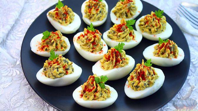 Уместная закуска на любом столе. ЯЙЦА, ФАРШИРОВАННЫЕ ГРИБАМИ И ОГУРЦАМИ
