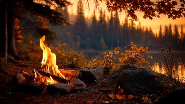 Осенний Камин 4К — Потрескивание костра у озера в осеннем лесу