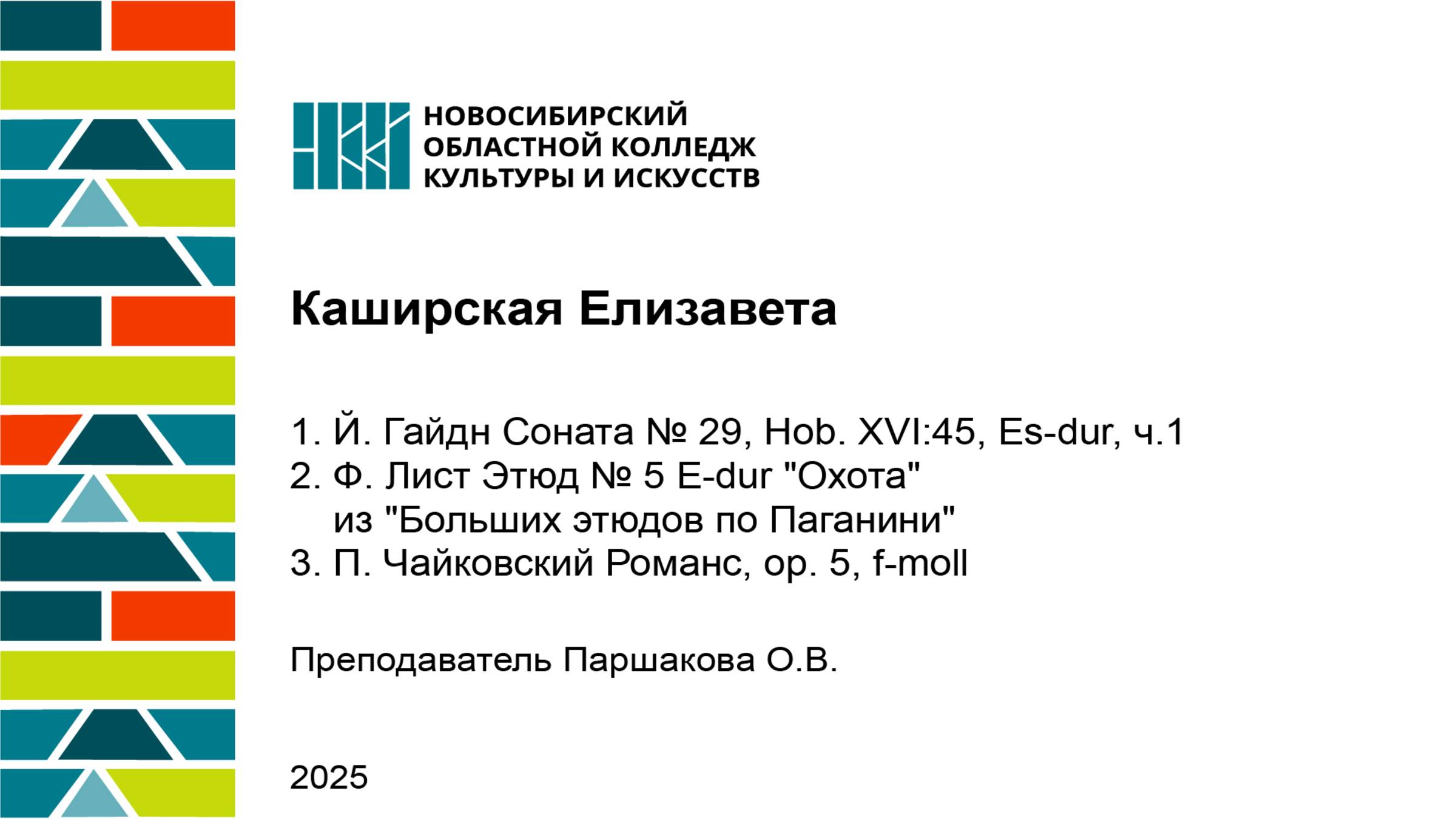 1. Й. Гайдн Соната № 29, Hob. XVI:45, Es-dur, ч.1 2. Ф. Лист Этюд № 5 E-dur "Охота" из "Больших этюдов по Паганини" 3. П. Чайковский Романс, ор. 5, f-moll преподаватель Паршакова О.В.