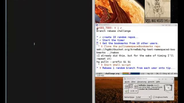 Showing the power of git - with Mercurials ease of use. This takes the rebasing challenge by felipec. All the code is available in https://bitbucket.org/ArneBab/hg-test-namespaced-bookmarks Notice: This has a far more complex repository structure than the test by FelipeC, because he could not provide his repos. So there are far more conflicts to resolve (on average there are 3-5 conflicting files per rebase, as opposed to 0-1 for FelipeC). The two dragon-images in the background were created by Trudy Wenzel¹ for http://1w6.org The red moon is from the KDE background images. ¹: Trudy Wenzel is a graphical artist and great hobby singer. You can find more of her graphical works on http://blackthumbstudios.artworkfolio.com/ License: GPLv3+