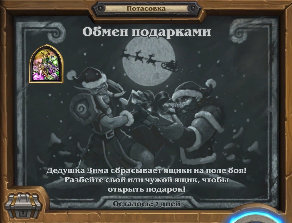 Потасовка в Hearthstone, в период с 28.12.2022 - 04.01.2023 Потасовка: Обмен подарками Дедушка Зима сбрасывает ящики на поле боя! Разбейте свой или чужой ящик, чтобы открыть подарок! Код колоды: AAEBAZ2rBAjalgOAmgPEuQPWuQPM0gOS3gP24wP3zgQL/RG/Fs8W9q4Cos0CrbYDsLYDsrYD7NED9eMDmJIFAA==