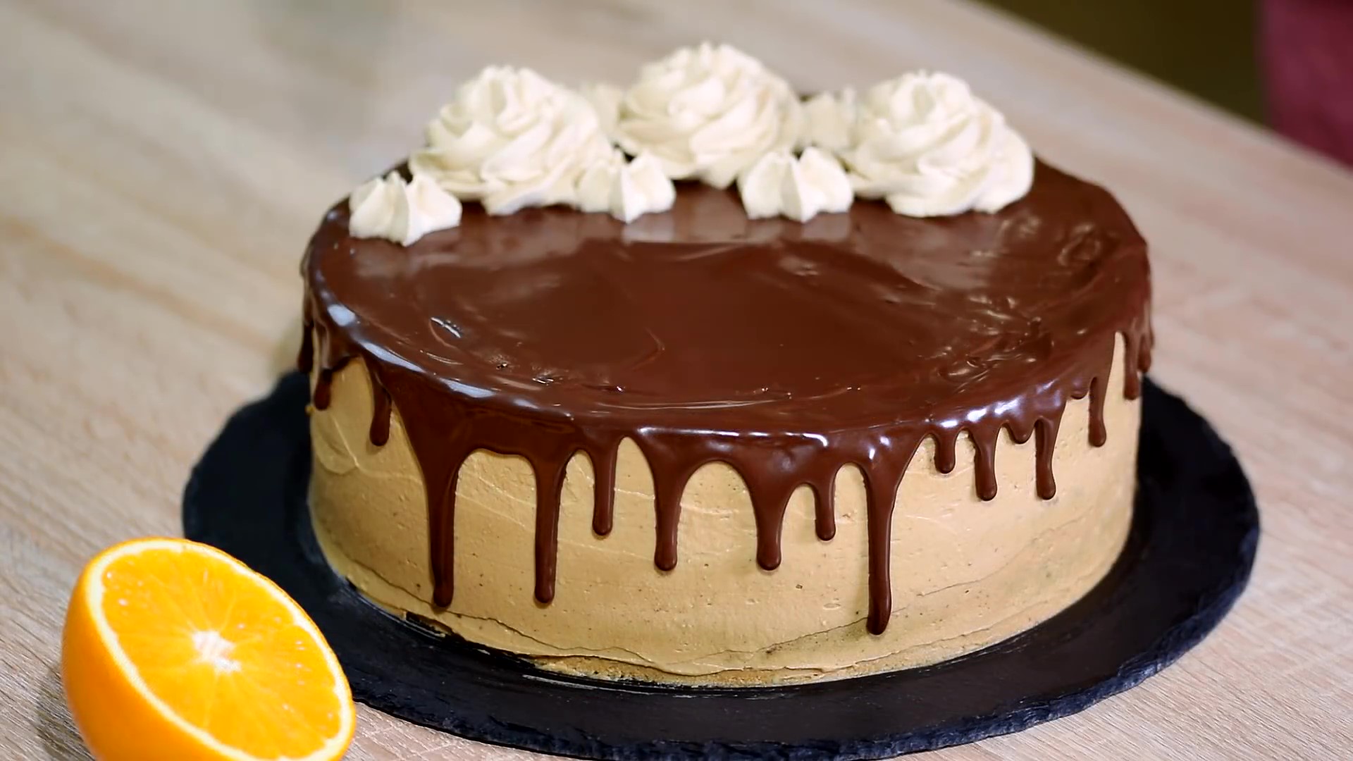 Ингредиенты: «Вес торта 1900 гр.» Для бисквита: Мука — 300 г. Какао-порошок — 20 г. Измельчённый фундук — 100 г. Разрыхлитель — 8 г. Соль — щепотка Яйца — 4 шт. Сахар — 250 г. Растительное масло — 200 мл. Свежевыжатый апельсиновый сок — 200 мл. Ванильный экстракт — 1 ч.л. Для крема: Маскарпоне — 300 г. Охлаждённые сливки 33-35% — 400 мл. Растворимое кофе — 2 ст.л. Сахарная пудра — 150 г. Для шоколадной глазури: Тёмный шоколад — 100 г. Горячие сливки 33-35% — 100 мл. Сливочное масло — 10 г. 1. Разогреть духовку до 180 °С. 2. Приготовить бисквит. В миске смешать муку, разрыхлитель, какао-порошок, измельчённый фундук и соль. Отложить миску в сторону. 3. Яйца взбить с сахаром добела, в течение 10 минут. Продолжая взбивание добавить ванильный экстракт, растительное масло и апельсиновый сок. Хорошо перемешать, затем постепенно ввести сухие ингредиенты. Взбить до однородной массы. 4. Готовое тесто вылить в форму диаметром 24 см, предварительно застеленную пергаментной бумагой. 5. Выпекать в разогретой духовке 40-45 минут. Готовность бисквита проверить деревянной шпажкой, если при прокалывании она выходит чистой из бисквита — значит он готов. 6. Готовый бисквит вынуть из духовки и дать остыть в течение 10 минут. Затем вынуть из формы и дать полностью остыть на решётке. 7. Приготовить крем. В миске соединить маскарпоне со сливками. Взбить миксером в течение 1 минуты, до однородной массы. Затем добавить растворимый кофе и сахарную пудру, взбить миксером до крепких пиков. 8. Остывший бисквит разрезать на 3 равные части. 9. Собрать торт. Положить первый корж на подставку для торта. Сверху выложить часть крема, равномерно распределить по коржу, затем сверху накрыть второй частью коржа и промазать кремом. Накрыть третей частью коржа, верх и бока торта покрыть кремом. Убрать торт в холодильник на 1 час. 10. Приготовить шоколадную глазурь. Тёмный шоколад залить горячими сливками и хорошо перемешать до полного растворения шоколада. Добавить сливочное масло и хорошо перемешать до однородной массы. 11. Достать торт из холодильника, по краю налить ганаш, таким образом делая подтёки по всей окружности торта, затем заполнить середину торта. Украсить торт оставшимся кремом и измельчённым фундуком. Готовый торт убрать торт в холодильник на 4 часа.