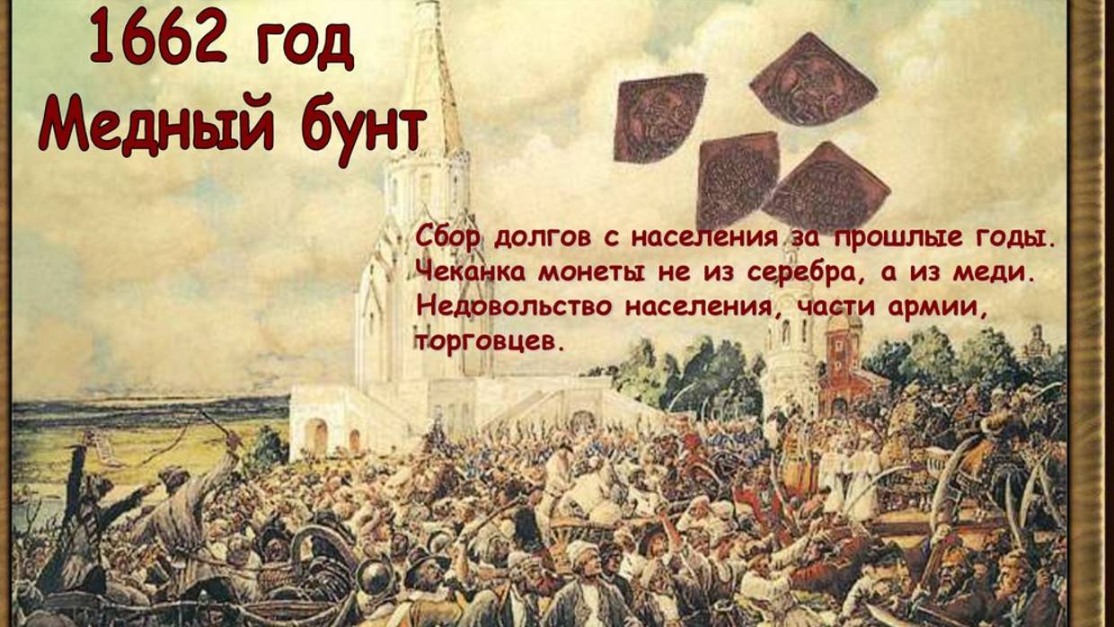 4 августа 1662 г. В Москве произошел «Медный бунт» — массовое восстание посадских людей против выпуска медных денег Продолжалась Русско-польская война (1654–1667 гг.) за западнорусские земли. Тяжелая война требовала денег, людей, различных материальных ресурсов. Естественно, что это ухудшало положение простого народа, который и так страдал от развития политики крепостничества со стороны правительств Романовых. Серебро стало исчезать из обращения. Его скупали, прятали. Правительство выпускало новые партии новых денег. Ими пытались платить жалованье войскам. В Литве и Малой Руси медь отказывались принимать. Ползли слухи, что медные деньги «ненастоящие». Мои контакты: Ютуб- https://www.youtube.com/channel/UC60YqkKksZaT2x-uLcUCCCg ВКонтакте- https://vk.com/oblinova1965 ОК- https://ok.ru/group/59523134783660/video/c4532140 Телеграм- https://web.telegram.org/a/#-1001443284231