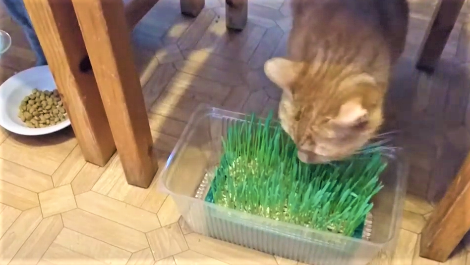 Мой кот обожает зелень - траву, капусту, кабачки... Чтоб меньше портил продукты - выращиваем для него овёс и другую траву из семян, которые продают в зоомагазинах. Зимой покупаем готовую траву, а вот летом в продаже только семена.