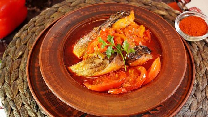 Рыба выкладывается между слоями лука, сладкого перца и помидоров и тушится в духовке. Благодаря предварительному обжариванию лука с паприкой пёркёльт из карпа приобретает яркий цвет и интересное послевкусие. #КарпвДуховке #РыбавДуховке #ВенгерскаяКухня #ТушенаяРыба #РыбасОвощами