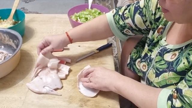 фкусная минутка-салат с кальмаром,,мешанина,, , кальмар фаршированный и обжареный( лучше запеченый)