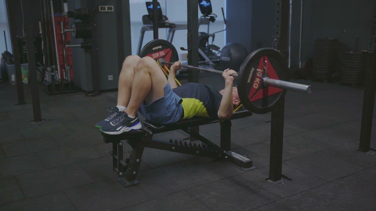Жим штанги лежа с сопротивлением резины и ногами на лавке/Banded bench press legless
