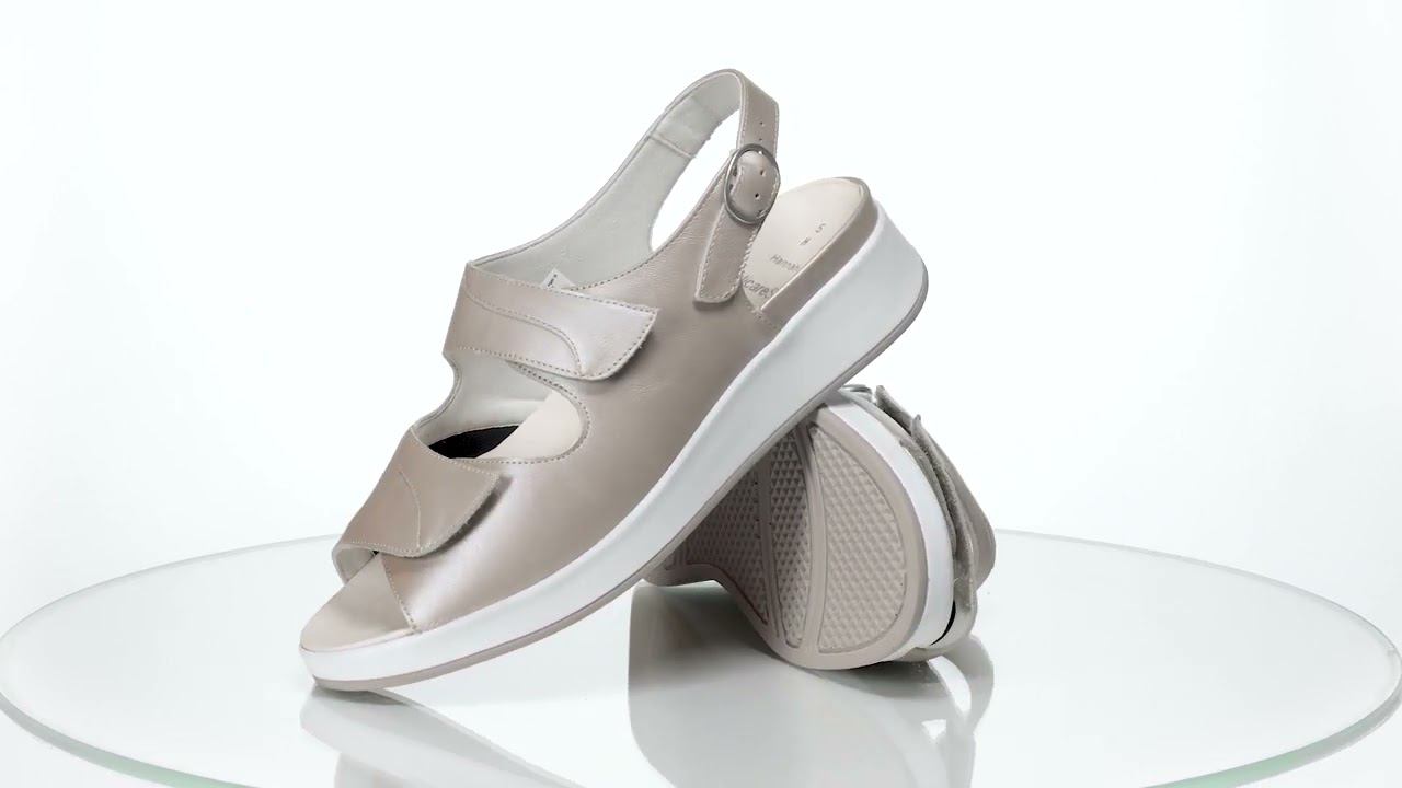 Мягкие, удобные сандалии на колодке Hannah на высокой танкетке имеют увеличенную полноту Н. Модель выполнена из натуральной кожи с эластичной вставкой из материала Nappaflex в области сустава большого пальца, что снимает давление с деформированных участков стопы.