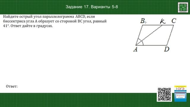 Диагонали AC и BD параллелограмма ABCD пересекаются в точке O, AC=22, BD=24, AB=3. Найдите DO. Найдите острый угол параллелограмма ABCD, если биссектриса угла A образует со стороной BC угол, равный 41°. Ответ дайте в градусах. Предыдущее видео https://rutube.ru/video/065f5f1ece5a451b3a768170e7e19de5/ Задание 17 варианты 5 - 8 из сборников 60 вариантов или 36 вариантов https://www.litres.ru/author/i-a-udakova/ Ссылка на плейлист с уроками https://rutube.ru/plst/904873 Открытый банк заданий ФИПИ https://oge.fipi.ru/bank/index.php?proj=DE0E276E497AB3784C3FC4CC20248DC0 Телеграмм канал «ОГЭ по математике «от простого к сложному» https://t.me/oge_math_ot_prostogo_k_slognomu Телеграмм канал «Школа математики для детей и взрослых» https://t.me/school_math_1_plus_1 /