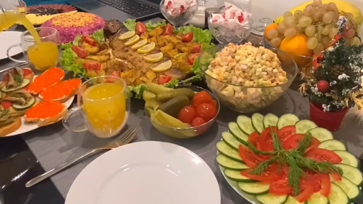 Поддержать канал ₽-⤴️ Ингредиенты: Фрукты: мандарин; апельсин; яблоко; банан; виноград. Бутерброды Ингредиенты: нарезная булка шпрот - 200 гр; красная икра - 100 гр; творожный сыр - 100 гр; огурец - 100 гр; помидоры - 100 гр; маринованные огурцы пучок укропа. Нарезки: огурец - 1 шт; помидор - 1 шт; Салат Оливье на Новогодний стол / Зимний салат Ингредиенты на 6-8 порции: картошка - 2 шт; морковь - 2 шт; колбаса варёная - 200 гр; маринованные огурцы - 1-2 шт; яйцо - 3 шт; лук - 50 гр; заленяй горошек - 70-100 гр; майонез - 3 - 4 ст.л. Салат СЕЛЕДКА под ШУБОЙ Ингредиенты на 4-6 порции: сельдь - 250 гр; лук - 50 гр; картошка - 2 шт; морковь - 2 шт; яйцо - 3 шт; свекла - 2 шт; майонез. Форель в духовке Ингредиенты для маринада: подсолнечное масло - 50 ст.л; сок 1 лимона; чеснок сушеный - 1,5 ч.л; приправа для рыбы - 2 ч.л; лимонный перец - 1 ч.л; соль - 1,5 ч.л. Ингредиенты для подушки: лук - 1-2 шт; лимон - 1 шт; сливочное масло - 50 гр. Ингредиенты для гарнира: картошка - 8 шт; сушеный чеснок - 1-2 ч.л; паприка - 1 ч.л; кавказские травы - 1 ч.л; панировочные сухари - 2 ч.л; подсолнечное масло - 30 мл; соль перец по вкусу.