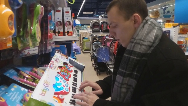 Сергей Попутный (Задунайский) играет в детском мире на игрушечном синтезаторе