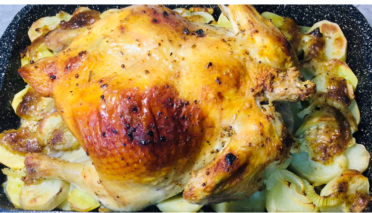 Курица на подушке из кабачка, картофеля и лука, приготовленная в духовке