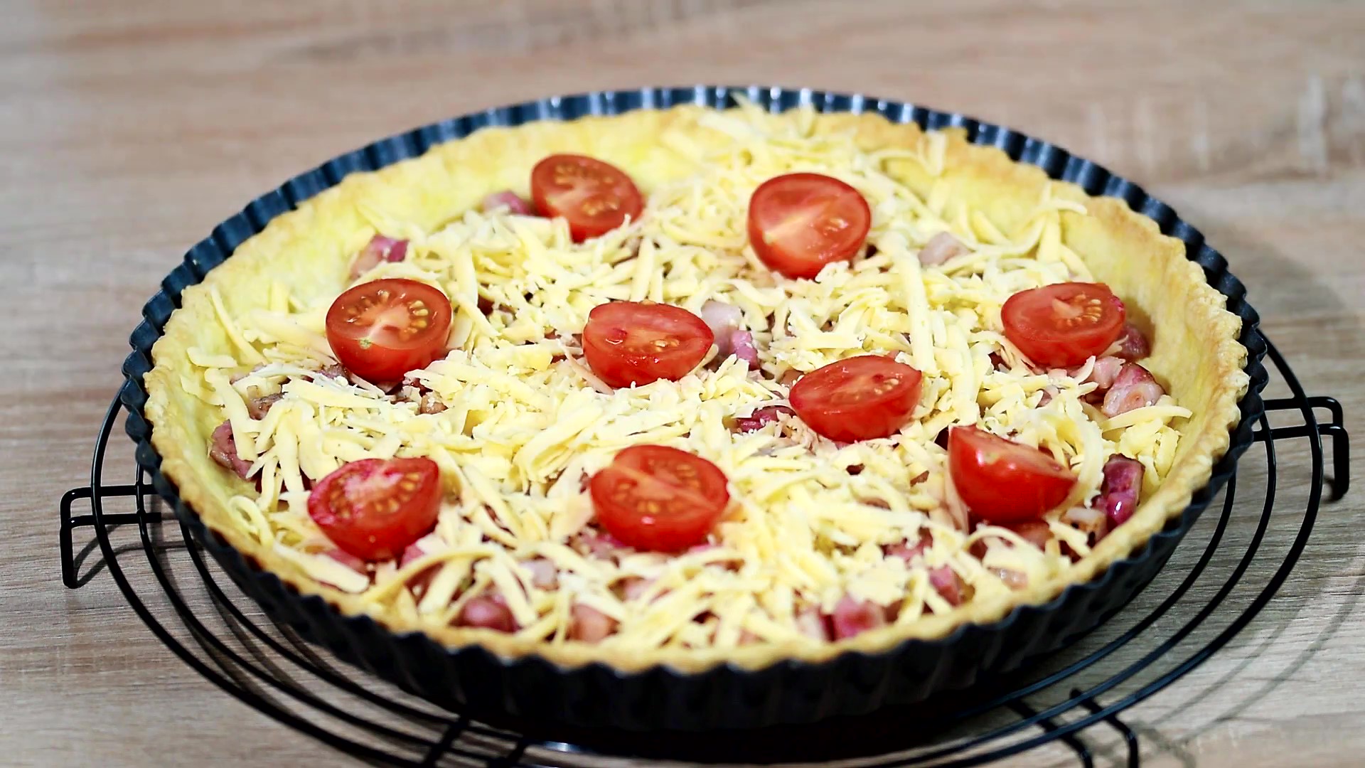 Ингредиенты: Для теста: Мука — 250 г. Яйцо — 1 шт. Охлаждённое сливочное масло — 120 г. Ледяная вода — 2-3 ст.л Соль — щепотка Для начинки: Бекон — 200 г. Помидоры черри — 100 г. Твёрдый сыр — 100 г. Сливки 33-35% — 100 мл. Молоко — 150 мл. Яйца — 2 шт. Соль, чёрный перец — по вкусу 1. Приготовить тесто. В миску добавить муку и соль перемешать. Добавить охлаждённое сливочное масло нарезанное на мелкие кубики. С помощью вилки или руками растереть в мелкую крошку. Добавить яйцо и несколько ложек холодной воды. Замесить тесто. 2. Тесто завернуть в полиэтиленовую плёнку и поместить в холодильник на 1 час. 3. Рабочую поверхность присыпать мукой. Раскатать тесто толщиной 4-5 мм. 4. Раскатанное тесто поместить в форму диаметром 28 см. Аккуратно сформировать бортики, излишки теста убрать. 5. Тесто наколоть вилкой и убрать в холодильник на 30 минут. 6. Разогреть духовку до 180 °С. 7. Достать форму из холодильника. Тесто застелить бумагой для выпечки, и внутрь формы всыпать груз «рис, фасоль или горох». Это делается для того, чтобы во время выпекания тесто не вздувалось, а бортики не опускались. 8. Выпекать в разогретой духовке 20 минут. Затем убрать бумагу с горохом и поместить в духовку ещё на 10 минут. 9. Приготовить начинку. Бекон нарезать на маленькие кубики. Выложить на разогретую сухую сковородку и жарить на среднем огне до золотистого цвета. Снять с огня и выложить на бумажное полотенце. 10. Сыр натереть на крупной тёрке. Помидоры черри разрезать пополам. 11. Яйца взбить венчиком до однородного состояния. Добавить соль, чёрный перец по вкусу. Солить следует осторожно «примерно 1/3 ч. л.», поскольку бекон и сыр, которые пойдут в начинку, уже достаточно солёные. Добавить сливки и молоко, перемешать до однородности. 12. На дно испечённой основы для пирога выложить обжаренный бекон, сверху равномерно распределить сыр, выложить помидоры черри. Залить всё яично-сливочной смесью. 13. Выпекать в разогретой духовке 30 -35 минут при 180 °С. Начинка должна загустеть и хорошо подрумяниться. 14. Киш вынуть из формы и через 15-20 минут можно подавать к столу.