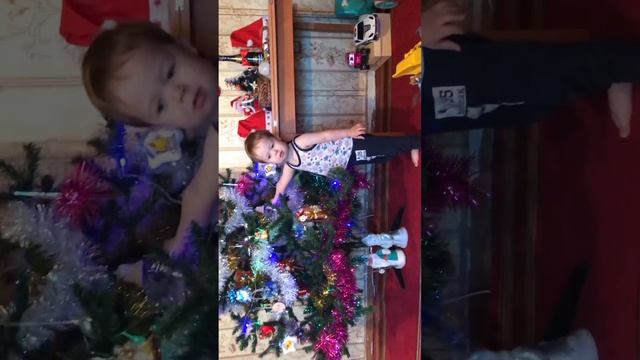 Взяли домой🐈⬛ котёнка.Пришёл конец красивой 🎄Ёлке.Котёнок забрался на самый верх по ёлке...Поразбивались стеклянные игрушки.Пришлость наряжать Ёлку другими игрушками, Бабушкина радость! Внук и котёнок !