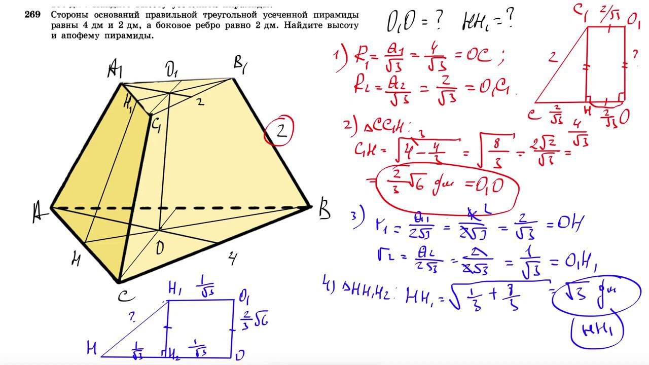 №269. Стороны оснований правильной треугольной усеченной пирамиды равны 4 дм и 2 дм, а боковое ребро равно 2 дм. Найдите высоту и апофему пирамиды. Поддержать канал рублём - 5469400944002125 (Сбербанк) Мой второй канал для подготовки к ЕГЭ и ОГЭ - https://www.youtube.com/ЕвгенийСумин Инстаграм - https://www.instagram.com/EGE_OGE.math Личный инстаграм - https://www.instagram.com/ee_sumin VK - https://vk.com/evgeniysumin FB - https://www.facebook.com/EvgeniySumin