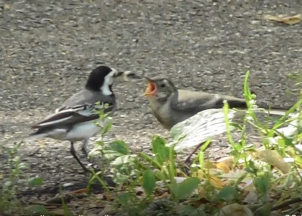 белая трясогузка, слёток всё ещё выпрашивает корм у родителя 09.07.2022, Великий Новгород.mp4