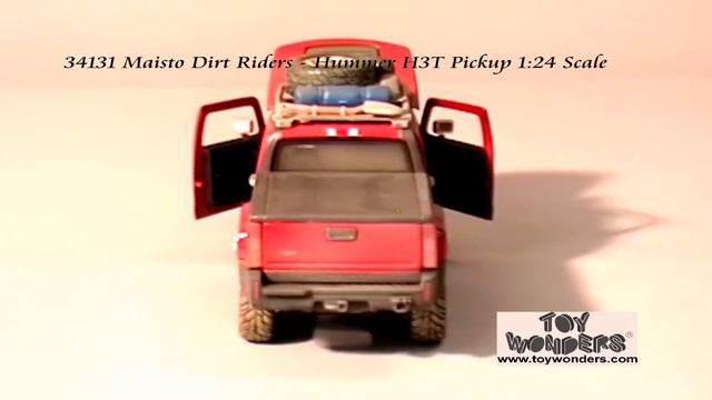 http://www.toywonders.com/productcart/pc/p10032.htm 34131 Maisto Dirt Riders - Hummer H3T Pickup Truck. 1:24 scale (1/24 scale) diecast collectible model car. This Hummer H3T pick-up is an 8"L x 2.75"W x 3.25"H die cast metal car with openable doors & hood. Free wheeling. This Hummer H3T is manufactured by Maisto. 4 pcs per display box in DUST and MUD color. GM is a trademark of the General Motors Corporation.