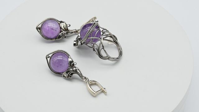 •Авторское украшение ручной работы. Камни установлены в оправу из ювелирного сплава - нейзильбер. •Форма и рисунок камня никогда не повторяются, что делает данное изделие единственным в своем роде. •Габарит кольца 18*31мм, серьги: 17*32мм., вес 12,1 г •Швензы изготовлены из серебра проба отсутствует. •Указаны габариты серьги без швензы. •На поверхности камня допустимо присутствие естественных природных прожилок и микротрещин. •При заказе вы покупаете образец, который представлен на фото. Цена: 12 809 руб. https://radugakamnya.ru/catalog/ukrasheniya_iz_kamnya_po_tipam/koltso_i_sergi_1/koltso_i_sergi_iz_ametista_razmer_17_5_3-549775/