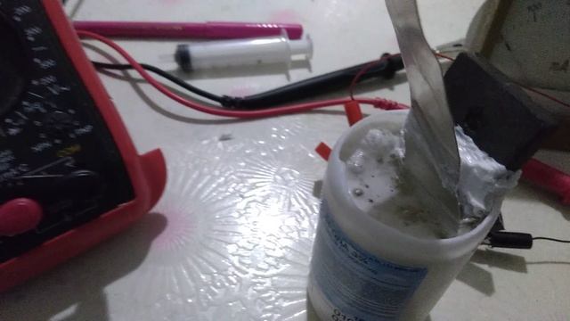 15мл.(3 по 5 куб шприца) очистителя радиатора на 100мл 3% перекиси водорода + 3 ложки чайные соли и получается неплохая наливная батарейка(баночка для аккумулятора) В которой, алюминий расходуется экономично! Такие заряжают Li-ion аккумуляторы(желательно через диод, на плюсе)