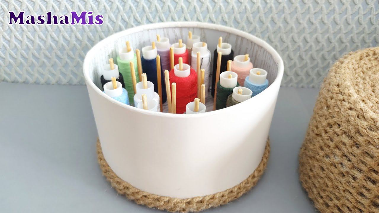 Как сделать органайзер для ниток из простых материалов своими руками. Простая идея для дома из коробки. Как хранить нитки. Материалы: картон, коробка от конфет, клей полимерный (Титан), джут, деревянные шпажки, горячий клей.