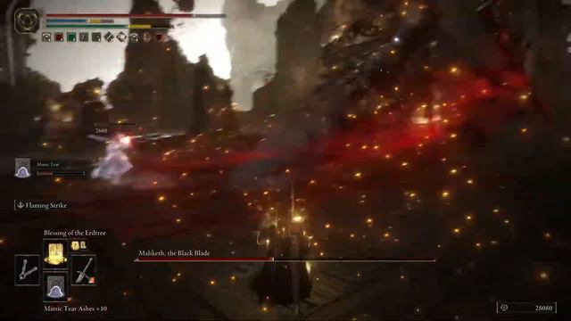 Elden Ring gameplay showing the Maliketh battle using a Paladin style faith build. Stats were 60 Vigor / 35 Endurance / 25 Mind / 25 Strength / 19 Dex / 60 Faith. Talismans used were Dragonrest Greatshield Talisman, Flame Scorpion Charm, and Erdtree’s Favor +1. Weapons were Banished Knight Greatswords with the Flame Art (faith scaling) affinity.