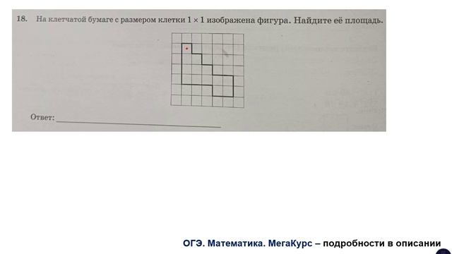 Задание 18. На клетчатой бумаге с размером клетки 1*1 изображена фигура. Найдите ее площадь. Тема задания - задания по клеткам Группа ВК для подготовки к ОГЭ: https://vk.com/secretroom2023 Видеокурс для подготовки к ОГЭ по математике: https://stepik.org/a/193288