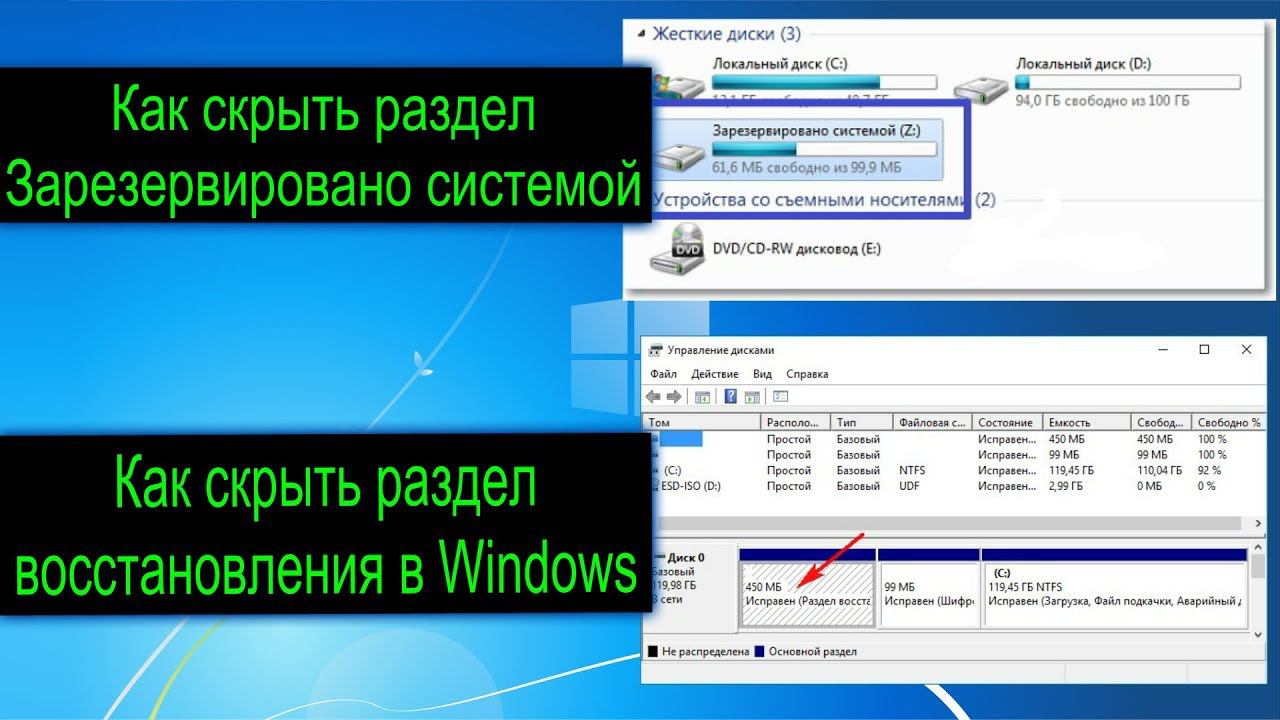 Как скрыть раздел зарезервировано системой или восстановления в Windows