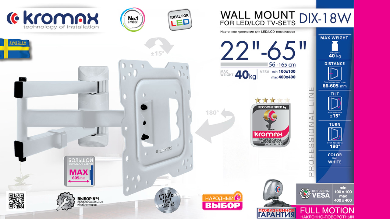 KROMAX DIX-18W WHITE надёжно удержит экран размером 22"-65" дюйма и весом 40 кг. Простая конструкция KROMAX DIX-18W WHITE идеально подойдет для самостоятельного монтажа. Наклонно-поворотная регулировка позволит наклонять вверх и вниз на ±15°, поворачивать влево и вправо на 180°, и выдвигать на 66-605 мм. Кронштейн подходит для большинства телевизоров популярных брендов, таких как Samsung, LG, Sony, Panasonic, Sharp, Toshiba, KIVI, Xiaomi Mi, SUPRA, Hyundai, Erisson, Horizont, JVC, Thomson, HAIER, BBK, Витязь, Веко, BQ, OZON, SkyLine, Pioneer, Philips, Rolsen, Harper, Hisense, Hitachi, Polarline, Prestigio и других. Крепёжные отверстия KROMAX DIX-18W WHITE изготовлены по стандарту VESA. В комплектацию KROMAX DIX-18W WHITE входят необходимые для монтажа материалы. Вся продукция обеспечивается гарантийными обязательствами. Пожизненная гарантия на все сварные и механические соединения позволит наслаждаться конструкцией долгий срок. Во время эксплуатации KROMAX DIX-18W WHITE демонстрирует поразительную износостойкость и безотказность. Подробнее https://www.kromax.ru/produce/pan_tilt/3284/