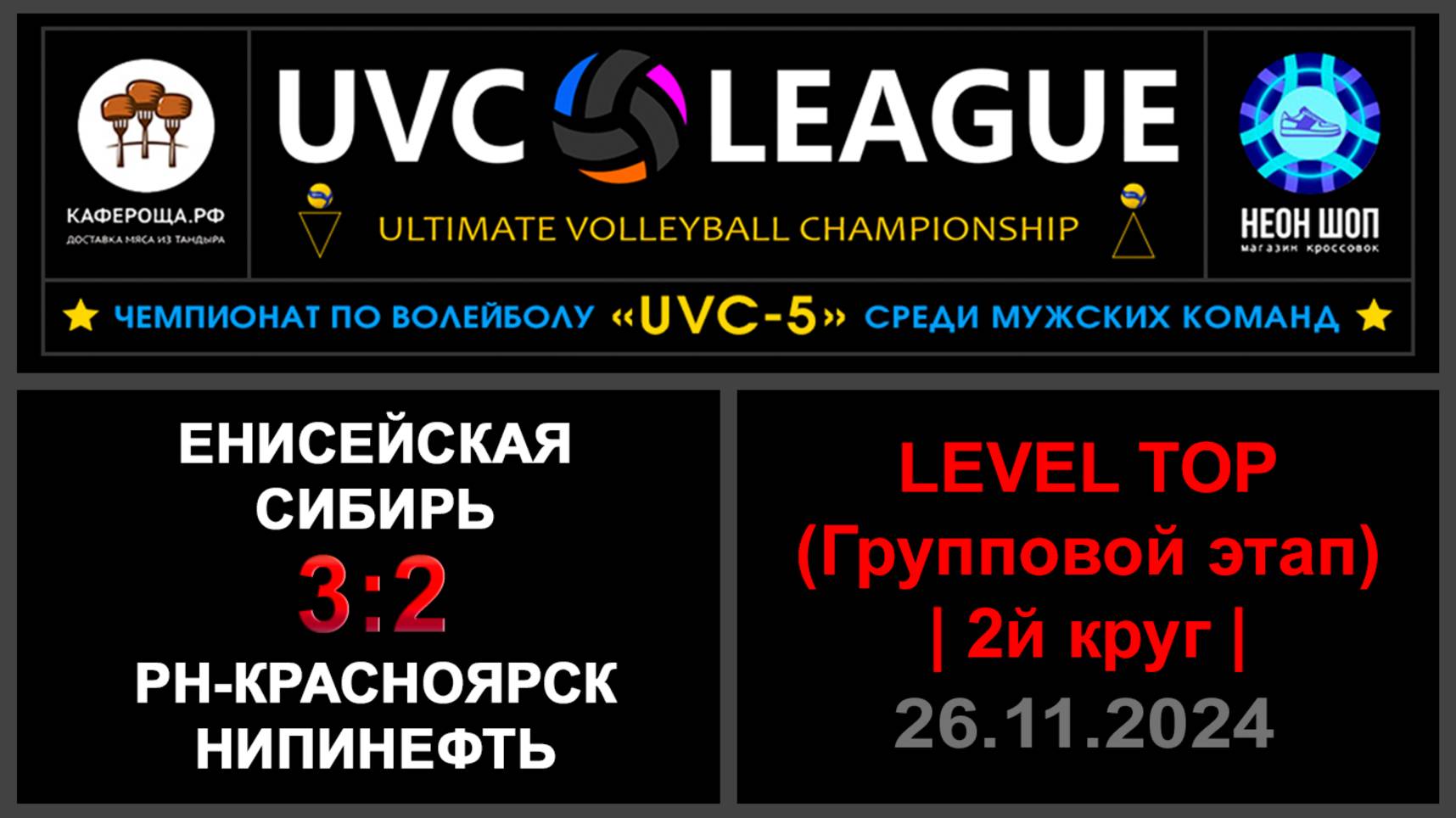 UVC-4 (Мужчины): Чемпионат UVC Лиги по волейболу среди мужских команд, 2024-2025 гг. Результаты игры: LEVEL ТОР (Групповой этап, 2й круг) 26.11.2024 Енисейская Сибирь - РН-КрасноярскНИПИнефть 3:2 (17:25, 25:17, 24:26, 25:21, 15:10) Конкурс «Робин Гуд»: ⛔Точных попаданий не было! #UVC_ЛИГА_ЧЕМПИОНАТ_UVC_5_Мужчины