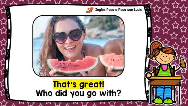 😃 En esta conversación Claire le está preguntando a Anna cómo le fue en sus vacaciones. 😃 Nos vamos a enfocar en el uso de preguntas con el AUXILIAR DID EN PASADO SIMPLE - SIMPLE PAST. 😃 Descarga la guía de estudio aquí: https://www.inglespasoapasoconlucie.com/2020/08/conversaciones-en-ingles-6/ 😃 Mira la serie de conversaciones en inglés: https://www.youtube.com/playlist?list=PL93iwVYt7GG4h909Ok-MbxZgL8IWZTyVG 😃 Estudia todas las lecciones desde "cero": https://www.youtube.com/playlist?list=PL93iwVYt7GG7OMmJZclmGo0ekKOzTi5o- REPASA EL SIMPLE PAST: 😃 PREGUNTAS USANDO EL AUXILIAR DID: https://youtu.be/LoY8Rd_PLSY Graphics provided by: https://www.inglespasoapasoconlucie.com/graphic-credits/ DERECHOS DE USO: Queda prohibido vender o hacer uso comercial de cualquier parte del material y videos encontrados en el canal de YouTube y sitio web de: Inglés Paso a Paso con Lucie / Cursos de Inglés ATS. No se puede alterar ninguna parte de este material para venderlo o usarlo como parte de un curso en línea o presencial, editarlo, cargarlo a redes sociales, o a hacer cualquier otro uso que no esté autorizado por escrito.