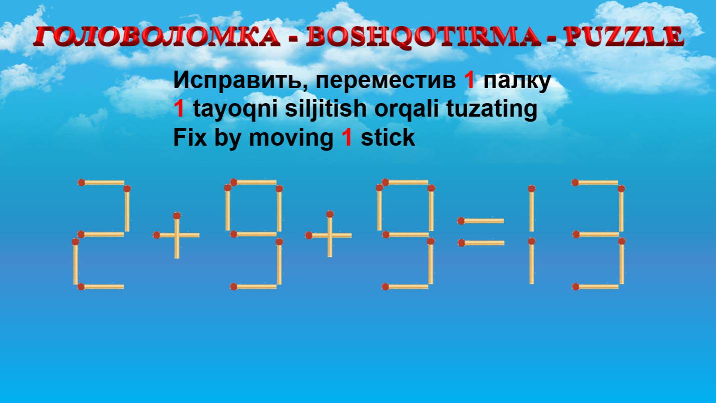 ГОЛОВОЛОМКА - BOSHQOTIRMA – PUZZLE. Спичка. 2+9+9=13, 2-5+6=6, 5+8-3=9, 5+2-4=0