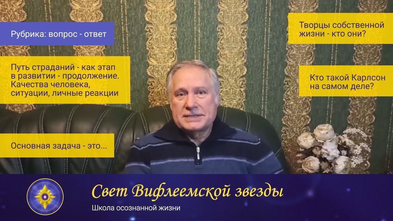 Однотипный круг ситуаций. Качества человека, ситуации и личные его реакции. Три категории людей. Творцы своей жизни - кто они? В чем заключается основная задача каждого? Посмотреть первую часть по теме “Путь страданий” можно в видео по ссылке https://youtu.be/cwksNVEhr5s “Почему мы страдаем? Круг Сансары или Путь страданий” Проявляйте активнось. Оставляйте Ваши комментарии. Наши каналы: Telegram https://t.me/svet_vifleyemskoyzvezdy VK https://vk.com/svet_vifleyemskoyzvezdy #человек #путьстраданий #этапжизни #ситуации #людииситуации #человеккактворецжизни #творец #качества #личныереакции #саморазвитие #осознаннаяжизнь #СветВифлеемскойзвезды #ОлегТолокин