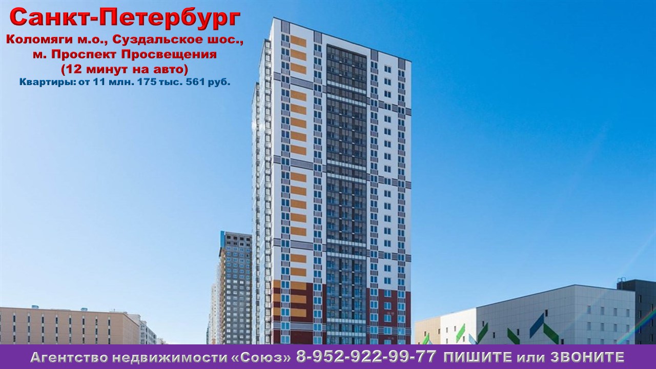 Агентство недвижимости «СОЮЗ» Покупайте: квартиру в Санкт-Петербурге. Коломяги м.о., Суздальское шос., м. Проспект Просвещения (12 минут на авто) Агент по новостройкам: 89529229977 (WhatsApp) Цены на квартиры точно такие же как и у застройщика. Заплатим за вас первоначальный взнос или вернем кешбэк в размере первоначального взноса по ипотеке за 60 дней. Акция распространяется на ограниченный список квартир и не суммируется с другими скидками и спецпредложениями. В ней участвуют только квартиры от застройщика. Квартиры продаются БЕЗ РИЭЛТОРСКОЙ КОМИССИИ !!!. 1к. квартиры: от 11 млн. 175 тыс. 561 руб. Ежемесячный платеж: 65 520 руб. при ставке 8% Площадь общая: 37,85 м2 - 55,4 м2 2к. квартиры: от 13 млн. 513 тыс. 675 руб. Ежемесячный платеж: 79 228 руб. при ставке 8% Площадь общая: 54,25 м2 - 77,38 м2 3к. квартиры: от 18 млн. 752 тыс. 064 руб. Ежемесячный платеж: 109 939 руб. при ставке 8% Площадь общая: 77,36 м2 - 86,49 м2 Срок сдачи: сдан - 4 кв. 2025 Срок выдачи ключей: 2 кв. 2022 - 4 кв. 2025 Договор: ДДУ Тип дома: кирпично-монолитный Тип отделки: отделка "под ключ" Парковка: подземная Потолки: 2,72 м. Преимущества:отделка "под ключ". Отличная транспортная доступность. Школа и детские сады. Экологически чистый район. Близость парков и заповедников. Просторные паркинги. Места для хранения велосипедов и колясок. Описание комплекса: Жилой комплекс находится в Приморском районе Санкт-Петербурга, в самом сердце зеленого массива на 140 гектаров. Рядом с комплексом расположены Суздальские озера и Шуваловский парк, а в 10 минутах езды – Юнтоловский заповедник. Лесная полоса окружает комплекс сразу с трех сторон: совсем рядом находится Новоорловский заповедник с обилием парков, озер и рекреационных территорий. Здания проекта органично вписаны в холмистый ландшафт с вековыми елями, где водятся зайцы, ежи, бобры и птицы. Концепция ЖК – это «город в городе»: семиэтажные корпуса и высотные здания в неоклассическом стиле окружены лесным массивом, а внутри квартала находятся широкие европейские пешеходные улицы и променады, торговые зоны, кафе, спортивные клубы, площадки для спорта и детских игр. В состав комплекса входят 3 современных детских сада на 140 мест каждый. Ваших малышей ждет безопасное, красивое и продуманное пространство с дизайнерским благоустройством территории. Современная школа на 825 мест совсем скоро откроет двери для своих первых школьников. Увеличенное панорамное остекление балконов позволяет впустить в квартиры больше света и открывает великолепные виды на лесные и парковые зоны. Нестандартные широкие балконы с увеличенной площадью позволяют организовать удобный капсульный кабинет или зону отдыха. Просторные парадные с выходами на улицу и во двор, места для колясок и велосипедов, комнаты мамы и малыша, туалетные комнаты и души для мытья лапок четвероногих любимцев. В одном из десяти просторных паркингов всегда найдется место для автомобиля. А в подвальных помещениях зданий расположены удобные кладовые для громоздких вещей, шин и спортинвентаря.