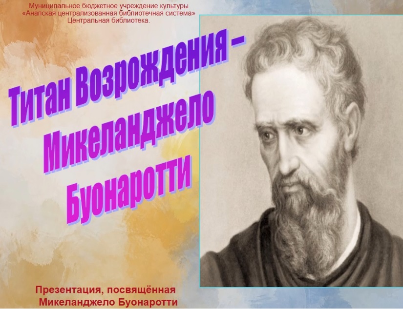 Микеланджело Буонаротти – признанный гений эпохи Возрождения, который принес неоценимый вклад в сокровищницу мировой культуры. Итальянское Возрождение дало миру немало прославленных мастеров, но исполинская мощь творческого гения Микеланджело выделяет его даже среди величайших художников этой эпохи. Он был всесторонне одаренным человеком. За свою творческую жизнь он создал гениальные произведения как в области живописи, так и в скульптуре, и в архитектуре. Микеланджело был борцом за светлые человеческие идеалы не только как художник, но и как гражданин Подготовила гл. библиограф отдела обслуживания МБУК Анапская ЦБС Кудрявцева Л.П.