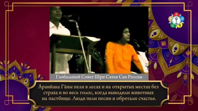 Глобальный Совет Шри Сатья Саи Россия В чём заключается вклад Сāмаведы? (часть 2-я из 2-х) Сатья Саи Баба, Божественная Беседа, 1 октября 1987 г. Каутхума – одна ветвь. Рāнāйанӣйа – ещё одна ветвь. Джайминӣйа – третья ветвь. Ветвь Сāмаведы Каутхума популярна в Гуджарате среди браминов Нагар. Ветвь Рāнāйанӣйа преобладает в Махараштре. Оставшаяся ветвь – Джайминӣйа. Она популярна в штате Карнатака. Между ветвями Сāмаведы Каутхума и Рāнāйанӣя нет большого различия. Различие между ветвями Каутхума и Рāнāйанӣйа можно проиллюстрировать с помощью звуков. Ветвь Каутхума в основном использует слоги «Ха», «Ву», «Ра» и «Ни». А Рāнāйанӣйа использует слоги «Ааа», «Вӯ», «Рā», «Нӣ». В ветви Рāнāйанӣйа слоги удлиняются. Каутхума, с другой стороны, сокращает произношение некоторых букв и удлиняет другие. Ветвь Джайминӣйа является основной и короткой, но она очень полезна для всего мира, поскольку является всеобъемлющей и систематизированной в форме песен. У неё есть два аспекта: Арчани и Гāны. Есть четыре вида Гāн (песней). Грāмагейа Гāны – песни, популярные в деревнях. Āранйака Гāны – песни, которые поют в лесах. Ӯха Гāны – песни, основанные на работе воображения. И четвёртый тип – Ӯхйа Гāны, пение про себя. В прошлом в деревнях не только в повседневной жизни и на праздниках, но и во многих особых случаях и событиях, таких как сбор урожая, посадка семян в полях и во время Санкрāнти, люди пели эти песни (Грāмагейа Гāны) и обретали счастье. Āранйака Гāны пели в лесах и на открытых местах без страха и во весь голос, когда выводили животных на пастбище. Люди пели песни и обретали счастье. Люди, воспевающие Āранйака Гāны, пели естественно, в естественном ритме, используя деревья и камни в качестве цимбал и наслаждаясь восхвалениям Богу. Третьим типом является Ӯха Гāны. Их можно сравнить с современными песнями из кинофильмов. В песнях из кинофильмов при их исполнении используются звуки, напоминающие печаль. Эти элементы добавляются в песни для выражения эмоций. На самом деле, нет ни плача, ни рыданий. Просто представляется, что кто-то плачет, и этот элемент добавляется в песню, создавая впечатление, что кто-то плачет. Это оставляет такое впечатление. Точно так же, только представляется, что есть смех, и это снимается для демонстрации другим. Это всё лишь искусственно. Чувство волнения представляется и показывается на экране, что отражается на зрителях. По правде говоря, нет ни плача, ни смеха, ни волнения. Они являются только частью Ӯха Гāны (песней, основанных на работе воображения). Четвёртый тип – Ӯхйа Гāны. В этом виде пения человек сначала переживает, чувствует единство, счастье, а затем распространяет это счастье на других. Сāмаведа предложила эти четыре типа песен всему миру. Основой и важным элементом всего этого является Пранава. Нет места, где не было бы Пранавы. Нет времени, когда нельзя было бы услышать Пранаву. Невозможно прожить без Пранавы ни мгновения. Пранава звучит и раздаётся в каждом атоме человеческого тела. Пранава пронизывает всё. Пранава является основой всех звуков. Также доказано, что Брахман является воплощением Пранавы. Говорится: «Ом Экāкшарам Брахма». Брахман описывается одним слогом («Ом»). Какова форма Брахмана, выраженная одной буквой? Это «Ом». Только этот однослоговый звук «Ом» называется формой Брахмана. Суть всего этого заключ