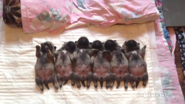 Уснувший в ряд мопсов отряд