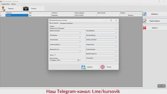 https://kursovik.com/programming/101450418.html Программа автоматизации рабочего места «Терапевт». Курсовая работа. Среда разработки: Visual Studio. Технология разработки: WindowForms. Среда программирования: Visual C# .NET 2019. База данных: Access. Данный программный продукт позволяет автоматизировать рабочее место терапевта. Первоначальным этапом является заполнение справочников системы, которые в дальнейшем используются для регистрации осмотра и выявленных проблем пациента. Также в системе ведется учет всех пациентов, с возможностью поиска по ключевым полям. При регистрации осмотра могут быть выбраны как единичные показатели, так и групповые. На основании осмотра терапевт назначает лечение и регистрирует эти данные на соответствующей форме. Приобрести исходники(все файлы проекта) данной программы Вы можете, заполнив следующую форму: https://kursovik.com/programming/101450418.html?camefrom=rutube#form Заказать отчёт(описание): https://kursovik.com/programming/101450418.html?camefrom=rutube#pz_need Заказать модификацию: https://kursovik.com/uniform.html?modify=101450418&camefrom=rutube Заказать новую программу: https://kursovik.com/programming_order.html?camefrom=rutube Задать вопрос автору: https://kursovik.com/programming/101450418.html?camefrom=rutube#vopros Наш Телеграм-БОТ для поиска готовых работ по программированию https://t.me/kursovikcom_bot , в нашей базе более 5и тысяч готовых работ, для более эффективного поиска используйте наш Телеграм-БОТ. Список наших готовых работ по программированию: https://kursovik.com/progtopic.html?camefrom=rutube Разработка программ на заказ согласно Вашему заданию: https://kursovik.com/programming_order.html?camefrom=rutube Мы пишем программы практически на всех языках программирования, работаем с различными базами данных, выполняем как мелкие задачки, так и крупные проекты. Разрабатываем и запускаем в работу ЧАТ-БОТы. Обращайтесь - всегда будем рады Вам помочь! Если нужно переписать данную программу на другой язык программирования - обращайтесь - сделаем. Адрес нашего сайта: https://kursovik.com Наши контакты: https://kursovik.com/contacts.html Наша группа ВК: https://vk.com/kursovik (всем подписчикам скидка 5%) Наш Телеграм-канал: https://t.me/kursovik (всем подписчикам скидка 5%) Наш Дзен-канал: https://dzen.ru/kursovik (всем подписчикам скидка 5%) Наш RuTube-канал: https://rutube.ru/channel/41864889 (всем подписчикам скидка 5%) Наш YouTube-канал: https://youtube.com/@kursovik_com (всем подписчикам скидка 5%) (скидки не суммируются :-) #курсоваяработа #базыданных #visualstudio #программирование
