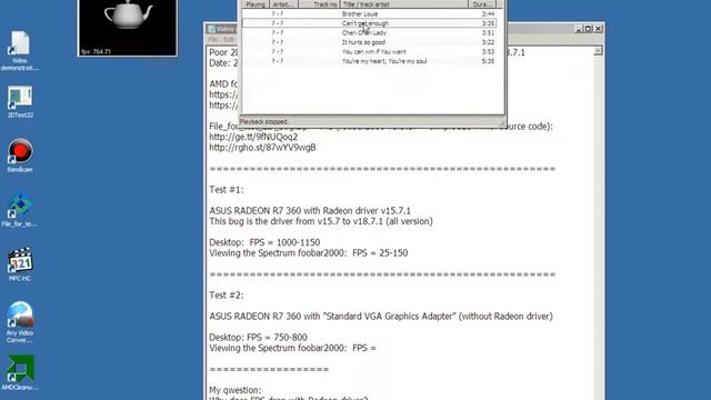 Poor 2D GDI performance Windows 7 with Radeon drivers version 15.7 - 18.7.1 Date: 29.07.2018 AMD forum: https://community.amd.com/thread/230437 https://community.amd.com/thread/227931 File_for_test_2D_Bug.zip - 4Mb (foobar2000 v1.3.17 + simpleGLUT with source code): http://ge.tt/9fNUQoq2 http://rgho.st/87wYV9wgB ==================================================== Test #1: ASUS RADEON R7 360 with Radeon driver v15.7.1 This bug is the driver from v15.7 to v18.7.1 (all version) Desktop: FPS = 1000-1150 Viewing the Spectrum foobar2000: FPS = 25-150 ==================================================== Test #2: ASUS RADEON R7 360 with "Standard VGA Graphics Adapter" (without Radeon driver) Desktop: FPS = 750-800 Viewing the Spectrum foobar2000: FPS = 690-730 ================== Bandicam video: Test #1: https://www.youtube.com/watch?v=QmFolEuMDzA Test #2: https://www.youtube.com/watch?v=te7Er9AI1Io ================== My qwestion: Why does FPS drop with Radeon driver??????