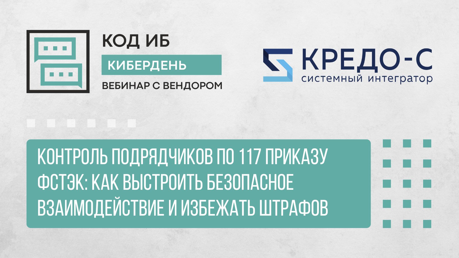 «Забор» между заказчиком и подрядчиком: как разделить ответственность по 117-му приказу и не получить штраф. На вебинаре разберем пошаговый алгоритм: от выбора надежного исполнителя до проверки его ИТ-инфраструктуры в процессе работ. Узнайте, как выполнить требования закона, не парализуя бизнес-процессы сложными проверками. В программе вебинара: — 117 приказ ФСТЭК: что именно заказчик обязан требовать от подрядчика — Классификация: типы подрядчиков и уровни доступа к вашим данным — Юридическая броня: как правильно включить требования ИБ в текст договора — Чек-лист: ключевые требования к системе защиты информации самого подрядчика — Compliance: методы оценки и аудита исполнителя перед стартом работ — Мониторинг: как контролировать действия внешних специалистов «в моменте» — Взгляд с другой стороны: что нужно внедрить подрядчику, чтобы соответствовать запросам крупных заказчиков _____________ КОД ИБ: семейство проектов, главная миссия которых — повышать зрелость бизнесов в вопросах информационной безопасности и растить профессионалов в ИБ. Здесь вы обязательно найдёте полезное об: информационной безопасности и кибербезопасности в целом, аутсорсинге и аудите в ИБ, хакерах, фишинге, кибератаках и уязвимостях, хранении персональных данных, искусственном интеллекте и нейронных сетях, аутентификации и биометрии, криптографии, использовании OpenSourсe, DLP и SIEM и многом другом. Полезные ссылки: Клуб Зубры кибербеза для тех, кто хочет расти в ИБ и не только https://codeib.academy/club Код ИБ АКАДЕМИЯ: https://codeib.academy График мероприятий: https://codeib.ru/event Библиотека безопасника с презентациями докладов: https://codeib.ru/slides Медиа-ресурсы: Сайт проекта Код ИБ http://codeib.ru Телеграм-канал Код ИБ https://t.me/codeibnews Вконтакте Код ИБ https://vk.com/codeib_community Телеграм-чат Codeibcommunity https://t.me/codeibcommunity