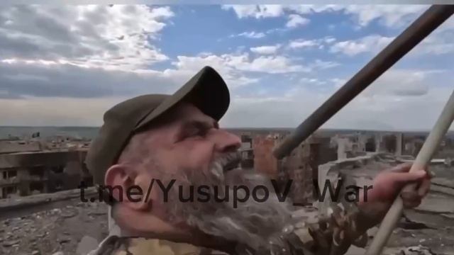 "Ратибор" водружает флаги РФ и ЧВК "Вагнер" на последней многоэтажке на окраине Артемовска - далее видны поля уходящие к Славянско-Краматорской агломерации.