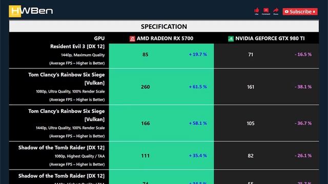 AMD Radeon RX 5700 vs nVidia GeForce GTX 980 Ti - Gaming 1080P 1440P (Ryzen 9 3950X) SYSTEM SPECS CPU: AMD Ryzen 9 3950X Mobo: MSI MPG X570S Carbon Max WiFi RAM: G.Skill TridentZ RGB 4x8GB DDR4-3200 Dual Rank CL14 OS: Windows 11 Version 21H2 GAMING BENCHMARK 1 - Assassin’s Creed Valhalla 2 - Death Stranding 3 - F1 2020 4 - Hitman 2 5 - Horizon Zero Dawn 6 - Resident Evil 3 7 - Tom Clancy’s Rainbow Six Siege [Vulkan] 8 - Shadow of the Tomb Raider 9 - Watch Dogs: Legion 10 - DOOM Eternal 11 - Godfall 12 - Microsoft Flight Simulator 2020 13 - Wolfenstein: Youngblood 14 - World War Z 15 - Power Consumption Source: https://hwben.com/amd-radeon-rx-5700-vs-nvidia-geforce-gtx-980-ti-gaming-1080p-1440p-ryzen-9-3950x/ Other benchmark: https://hwben.com BUY FROM AMAZON - AMD Radeon RX 5700 : https://hwben.com/noindex/buy.php?q=AMD+Radeon+RX+5700 - nVidia GeForce GTX 980 Ti : https://hwben.com/noindex/buy.php?q=nVidia+GeForce+GTX+980+Ti KEYWORDS: - RX 5700 vs GTX 980 TI - GTX 980 TI vs RX 5700 Partner: https://testi.xyz #RX5700 #GTX980TI
