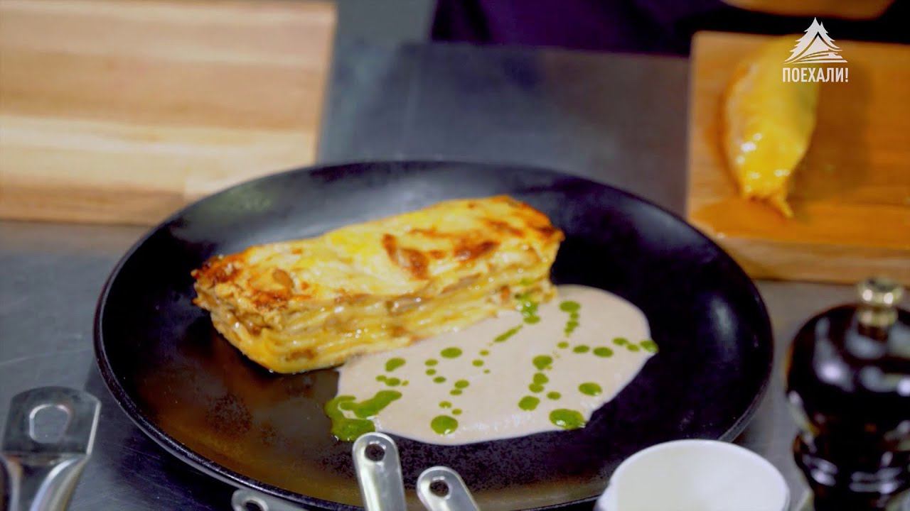 Лазанья с лесными грибами, соусом из шампиньонов и зелёным маслом