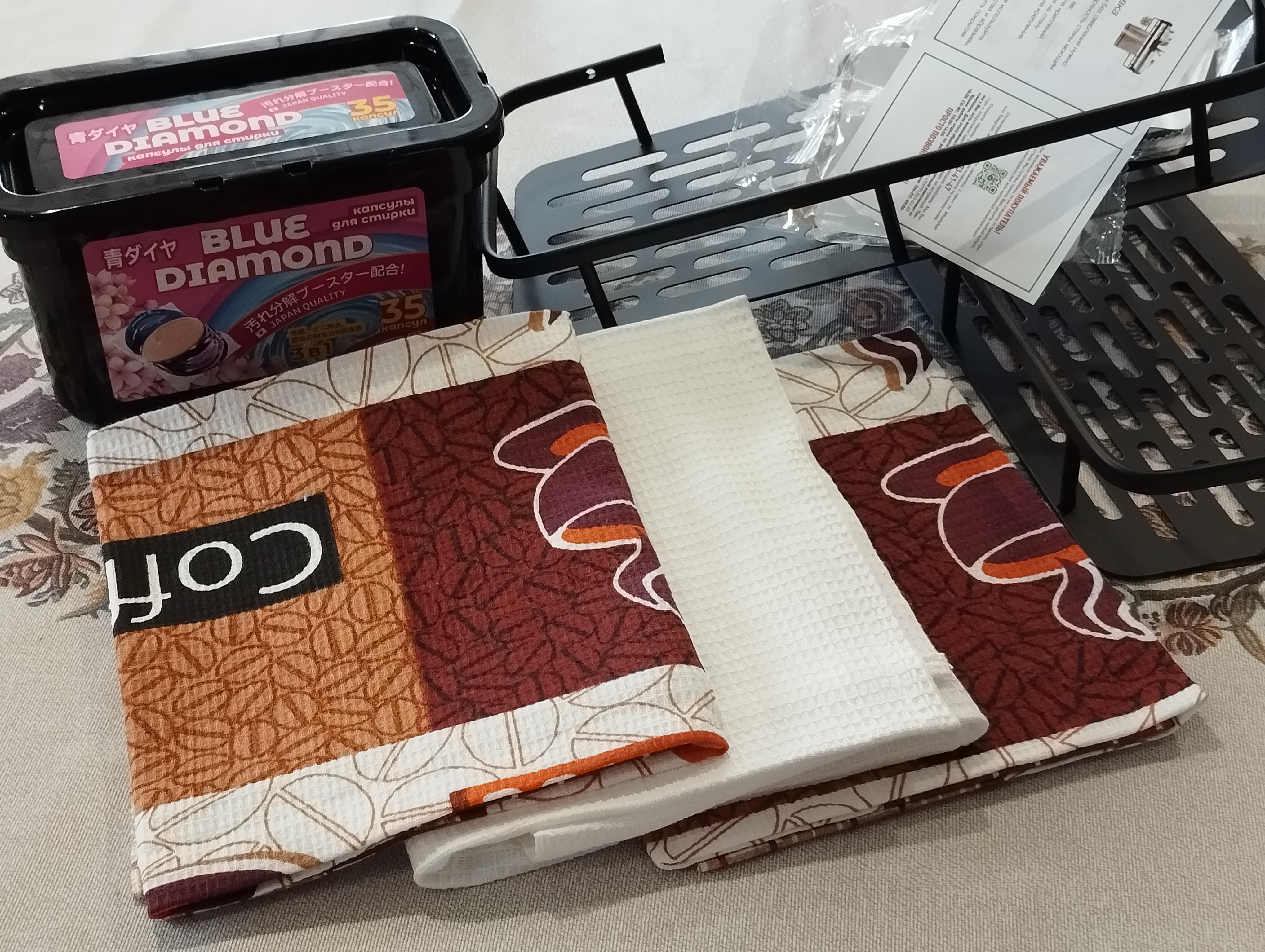 Капсулы Blue Diamond для стирки 3 в 1 https://market.yandex.ru/cc/JBDP9EE Полка для ванной и душевой без сверления на присосках Wiekk, прямая, черная, металлическая (комплект 2 шт.) https://market.yandex.ru/cc/YvydLGG Губка для уборки с ручкой, Shiny Kitchen, Губка для посуды/ Щетка для ванной большая/ Щетка для кафеля хозяйственная https://market.yandex.ru/cc/nzjqCR9 Frosch Средство для удаления жира Грейпфрут 500 мл https://market.yandex.ru/cc/G0Dhqhv Набор кухонных полотенец Уютно! Кофейный, хлопок 100%, 50х60 см, 3 шт https://market.yandex.ru/cc/N6mi7QX